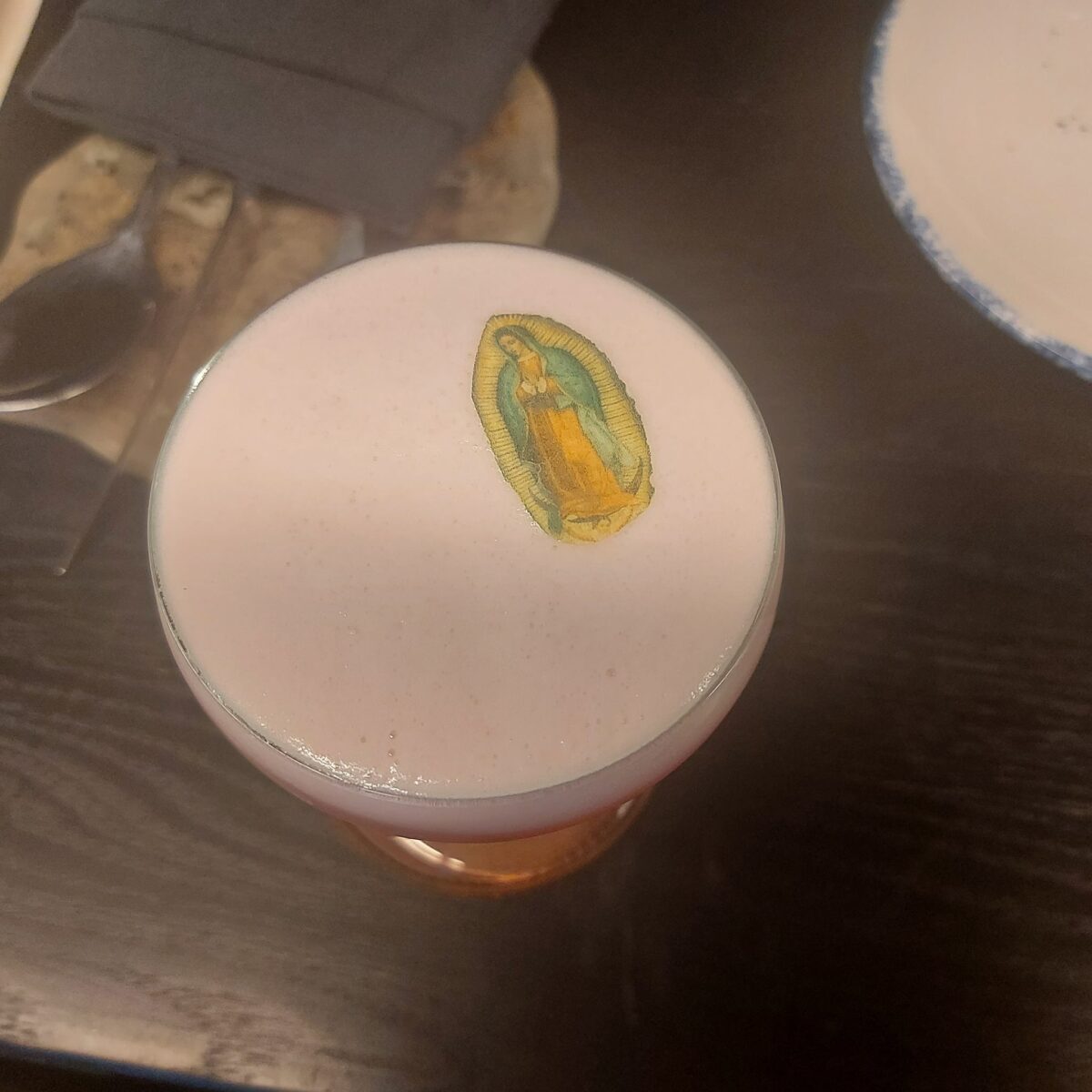 Pues les cuento que ayer, durante la cena con la Negra Lugones y familia, en el restaurant Xokol cuya especialidad es que todo es de maíz, a mi vecino de asiento, un gringo muy simpático, le sirvieron su bebida “Adelita” con una Virgen de Guadalupe flotando sobre un manto espumoso.