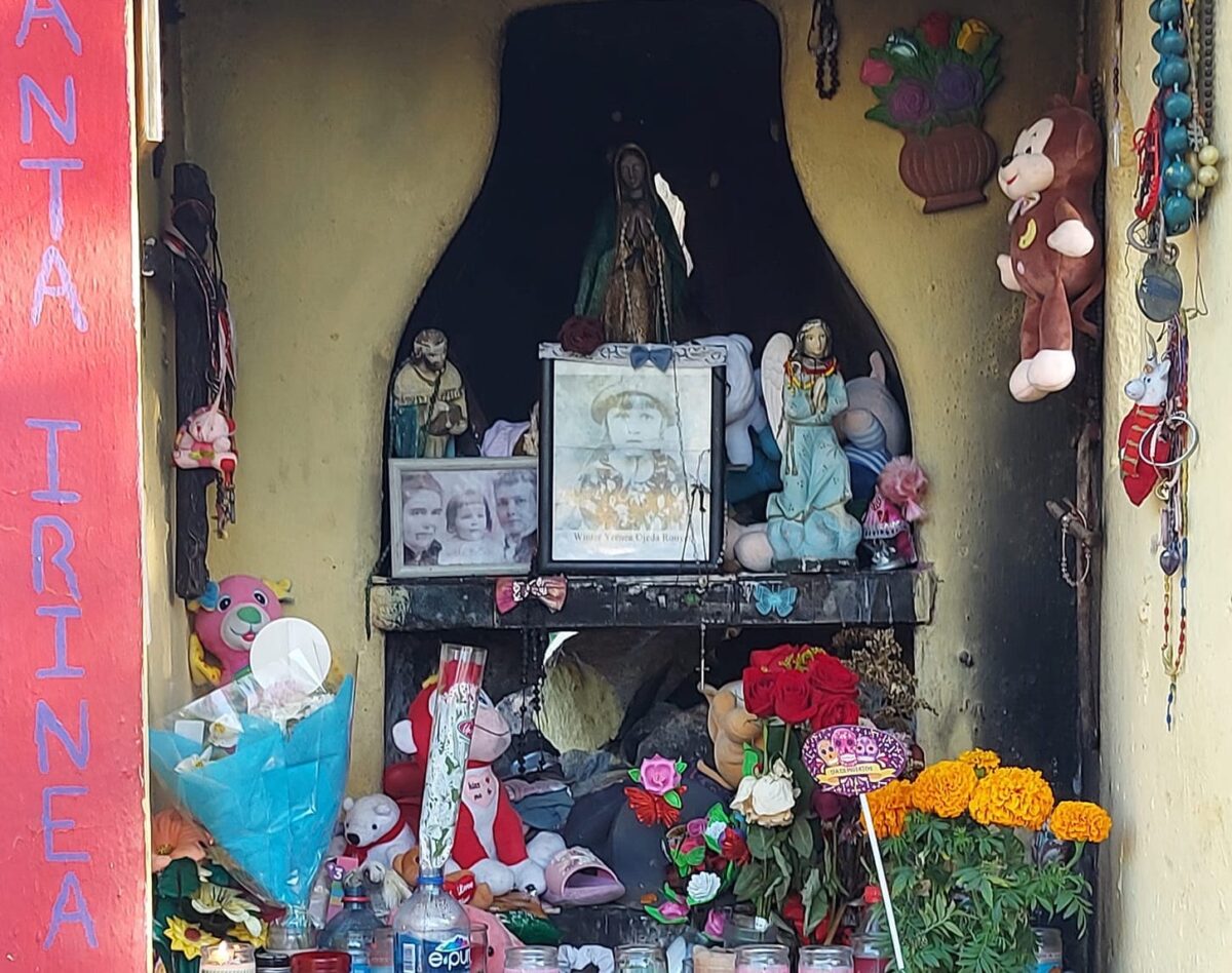 Mi radar de altares y capillas en carretera captó un altar denso. Sin saber de qué se trataba le pedí a Diego que de regreso parara ahí para ver ese altar en el kilómetro 173 de la carretera a La Paz. Así lo hizo y cual fue mi sorpresa descubrir una capilla a una animita considerada santa por los locales. Se trata de la niña vidente del Triunfo, un pueblo minero hoy pueblo fantasma. Se llama Winter Irinea. Estando ahí llegó un auto con dos señoras y un joven, no se querían bajar por mi presencia. Me acerqué a preguntar y una de ellas me puso un audio de un programa de lo sobrenatural que narra la historia de cómo la niña mala se convirtió en una santa popular muy milagrosa. La gente le lleva juguetes y le pide protección para los niños…. pero si te ríes de ella te caerá la maldición. Va una probadita: