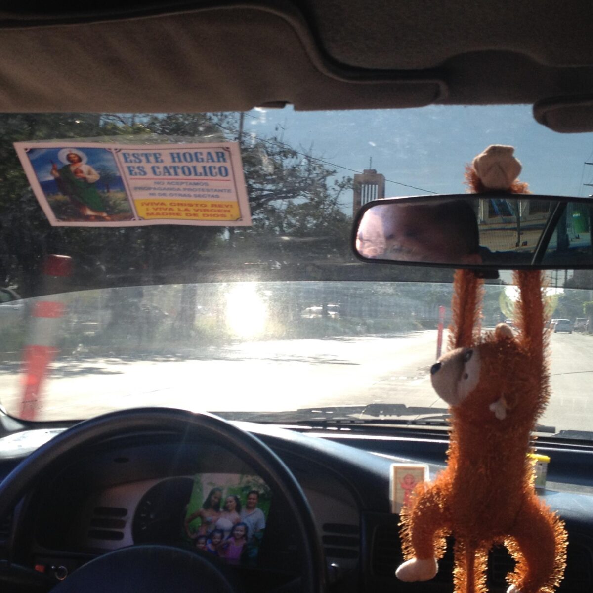 Un taxi que se protege contra propaganda protestante. Le pedí permiso al chofer para tomar una foto, pues tengo un amigo argentino que colecciona fotos de taxis convertidos en altares y había que demostrarle que en Guadalajara también teníamos lo nuestro. No solo le dio gusto que fotografiáramos su altar, sino que acto seguido me regalo dos estampas protectoras, la de San Judas Tadeo, protector de causas injustas y la de Santo Santiago patrono de Nextipac, Zapopan, donde se conserva la tradición de los tastuanes, fieras bestias humanas que luchan contra Santo Santiago conmemorando la Conquista.